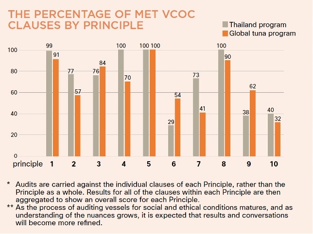 We’ve also been particularly pleased with a number of other companies that have been actively involved in efforts to complete any AFIs identified in the audits and that have an overall high level of achieving the VCoC clauses. These companies, all of which operate tuna purse seine vessels from which Thai Union sources from, are Albacora (Spain), Sapmer (France), Echebaster (Spain) and Saupiquet/Bolton (French/Italian). Each of these companies have demonstrated that work on their vessels is conducted voluntarily with no forced or compulsory labor; workers are paid fair wages and work reasonable hours; and their health and safety are protected at work.