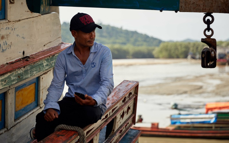 Caption: A fisherman uses his mobile phone on a fishing vessel in the south of Thailand. Photo credit: Thai Union