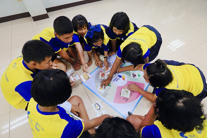 A group of students match pictures of menus with the five major food groups during a Thai Union nutritional workshop held at Wat Srisudtharam School in Samut Sakhon. Photo credit: Wichaw Apiluxpoovadol/Thai Union