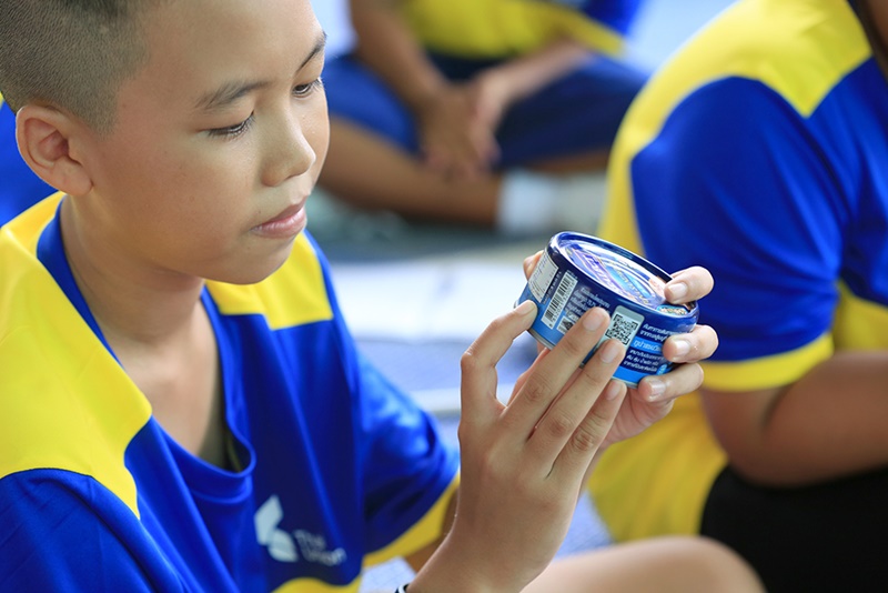A student reading the nutrition label on a can of SEALECT tuna during a Thai Union nutritional workshop conducted at Wat Srisudtharam School in Samut Sakhon. Photo credit: Wichaw Apiluxpoovadol/Thai Union