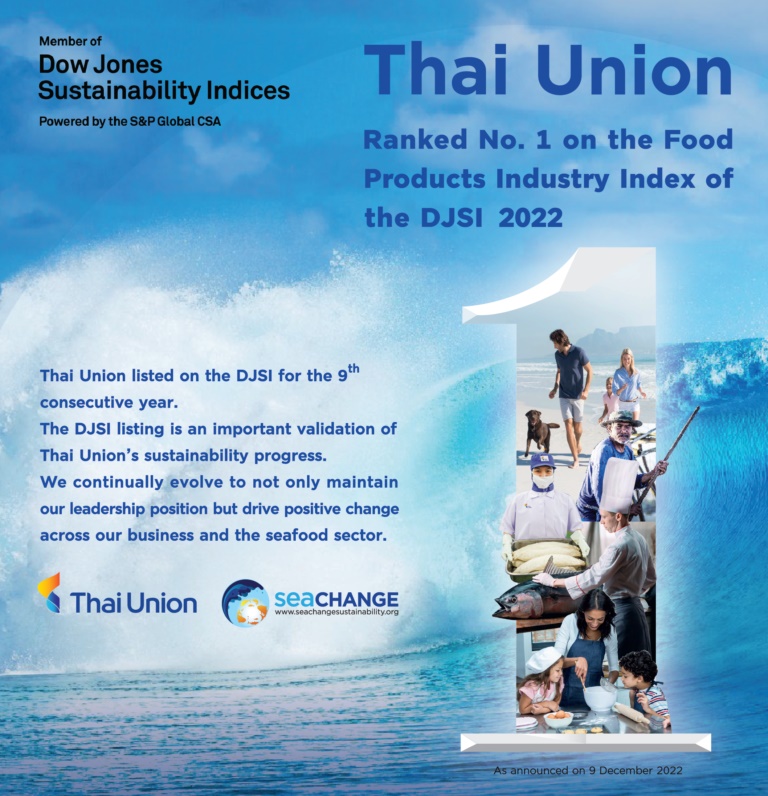 Bangkok – 12 December 2022 – Thai Union Group PCL, one of the world’s largest seafood companies, has been ranked number one in the world in the food industry on the Dow Jones Sustainability Indices (DJSI), further validating the progress made under its global sustainability strategy, SeaChange®.