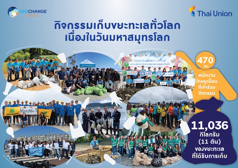 กรุงเทพฯ – 10 มิถุนายน 2567 – บริษัท ไทยยูเนี่ยน กรุ๊ป จำกัด (มหาชน) จัดกิจกรรมเก็บขยะทะเลในชุมชนท้องถิ่นในประเทศไทย สหรัฐอเมริกา แอฟริกา และยุโรป เนื่องในวันมหาสมุทรโลก โดยในปีนี้มีอาสาสมัครไทยยูเนี่ยน จำนวน 470 คน ร่วมกันเก็บขยะทะเล 9 แห่ง ในพื้นที่ 4 ทวีป เพื่อร่วมเป็นส่วนหนึ่งในกลยุทธ์ความยั่งยืน SeaChange®2030 เรื่องการลดขยะพลาสติกในทะเลไม่ให้ปนเปื้อนสู่แม่น้ำลำคลองและทะเลให้ได้ตามเป้าหมาย 1,500 ตัน ภายในปี 2573
